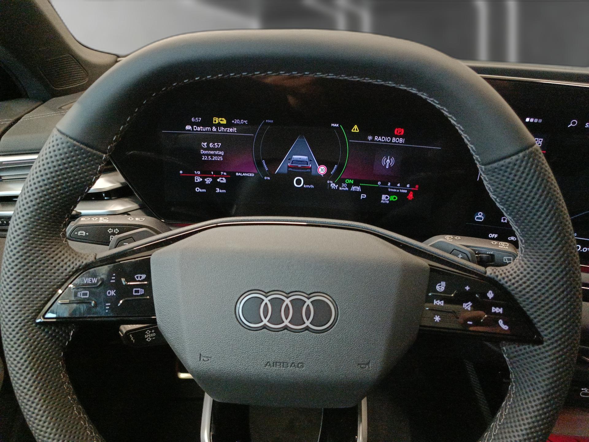 Ausstattungs-Paket: Tech Pro (Komfort-Paket Plus - Aussenspiegel elektr. verstell- - heiz- und anklappbar - mit Abblendautomatik und Bordsteinautomatik - Aussenspiegel mit Bordsteinautomatik - rechts - Aussenspiegel mit Projektionsfunktion - Digitaler Fahrzeugschlüssel - Innenspiegel mit Abblendautomatik - Spurwechselassistent (Side Assist) mit Ausstiegswarnung und Querverkehrs-Assistent - Matrix-LED-Scheinwerfer - Digitale Heckleuchten OLED - Scheinwerfer-Reinigungsanlage (SRA) - MMI Beifahrer-Display - Multi-Media-Interface MMI Navigation Plus mit MMI Touch - Parklenkassistent plus - Einparkhilfe plus vorn - seitlich und hinten - akustisch und optisch mit Umgebungsanzeige - Adaptive Geschwindigkeitsregelanlage Plus (Adaptive Cruise Control) mit Autom. Distanzregelung - Seitenairbag vorn mitte (Interaktionsairbag) - Kopf-Airbag-System (Sideguard) - Seitenairbag vorn und hinten - Komfort-Klimaautomatik 3-Zonen - Sitzheizung vorn und hinten - Kamerasystem Umgebungskamera - Insassenerkennung im Fond - Sport-Fahrwerk (Dämpfer einstellbar) - Lenkrad heizbar (Leder) - Lenksäule (Lenkrad) elektr. verstellbar)